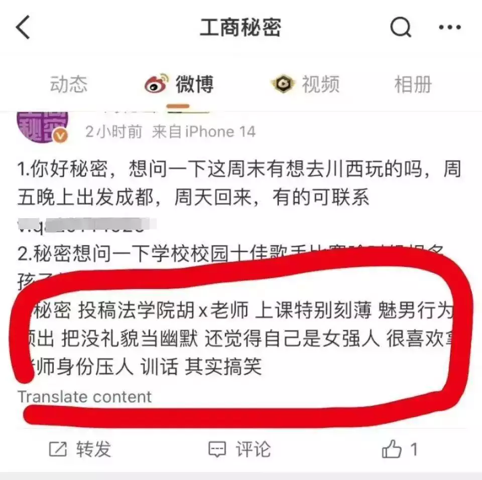 10月29日,重庆工商大学相关校园账号“工商秘密”上出现一则匿名帖子,矛头指向该校法学与社会学学院一位胡姓教师,称其“上课特别刻薄、魅男行为频出、把没礼貌当幽默”。这则模糊指代的投稿在网络上快速传播,引发关注。